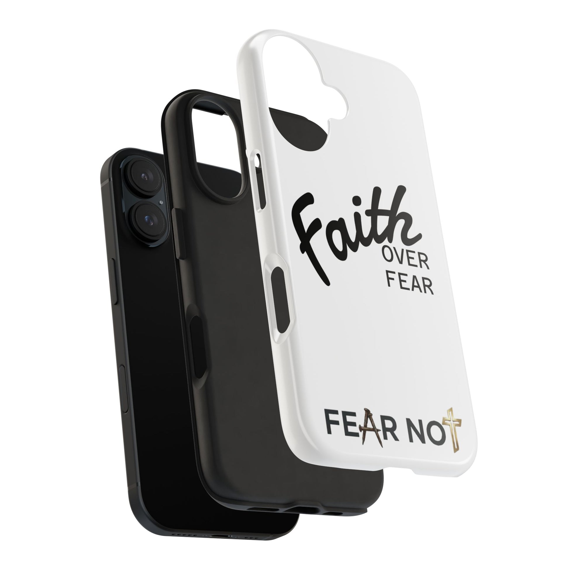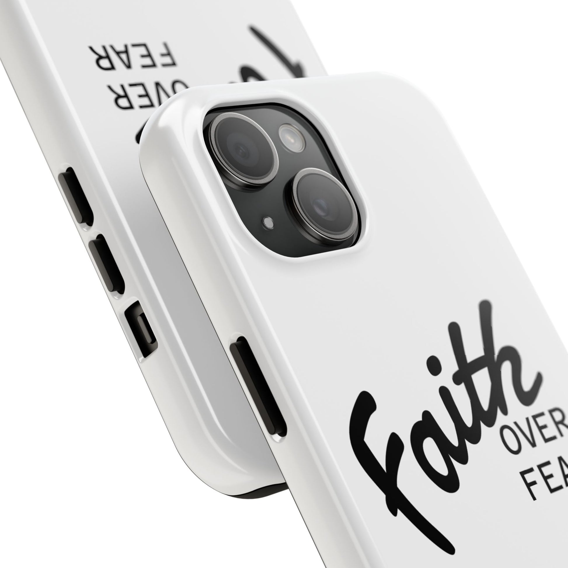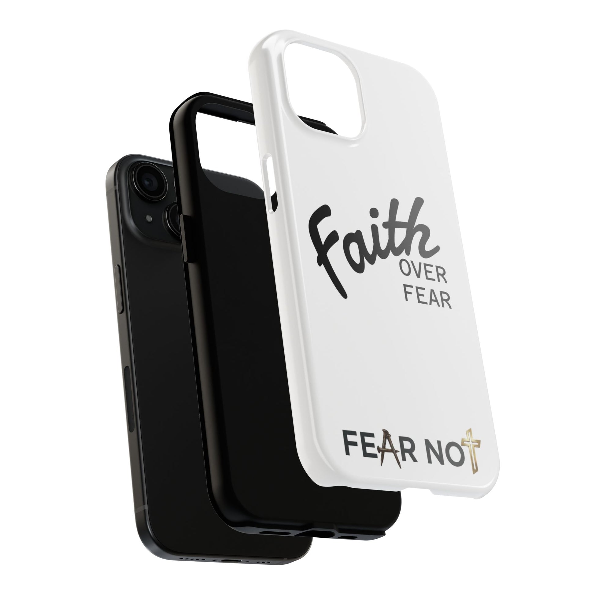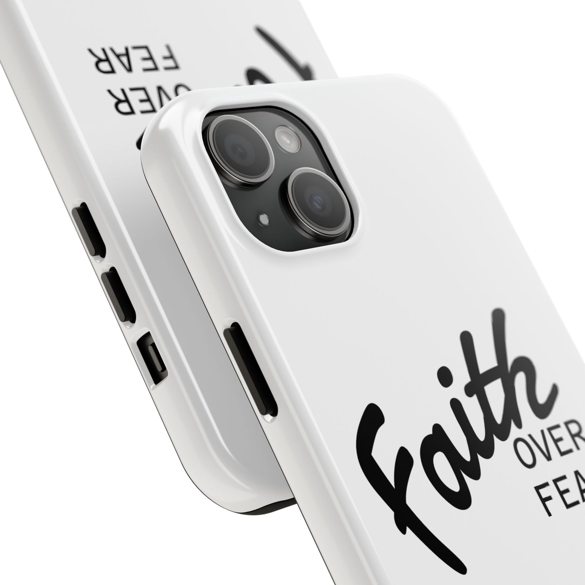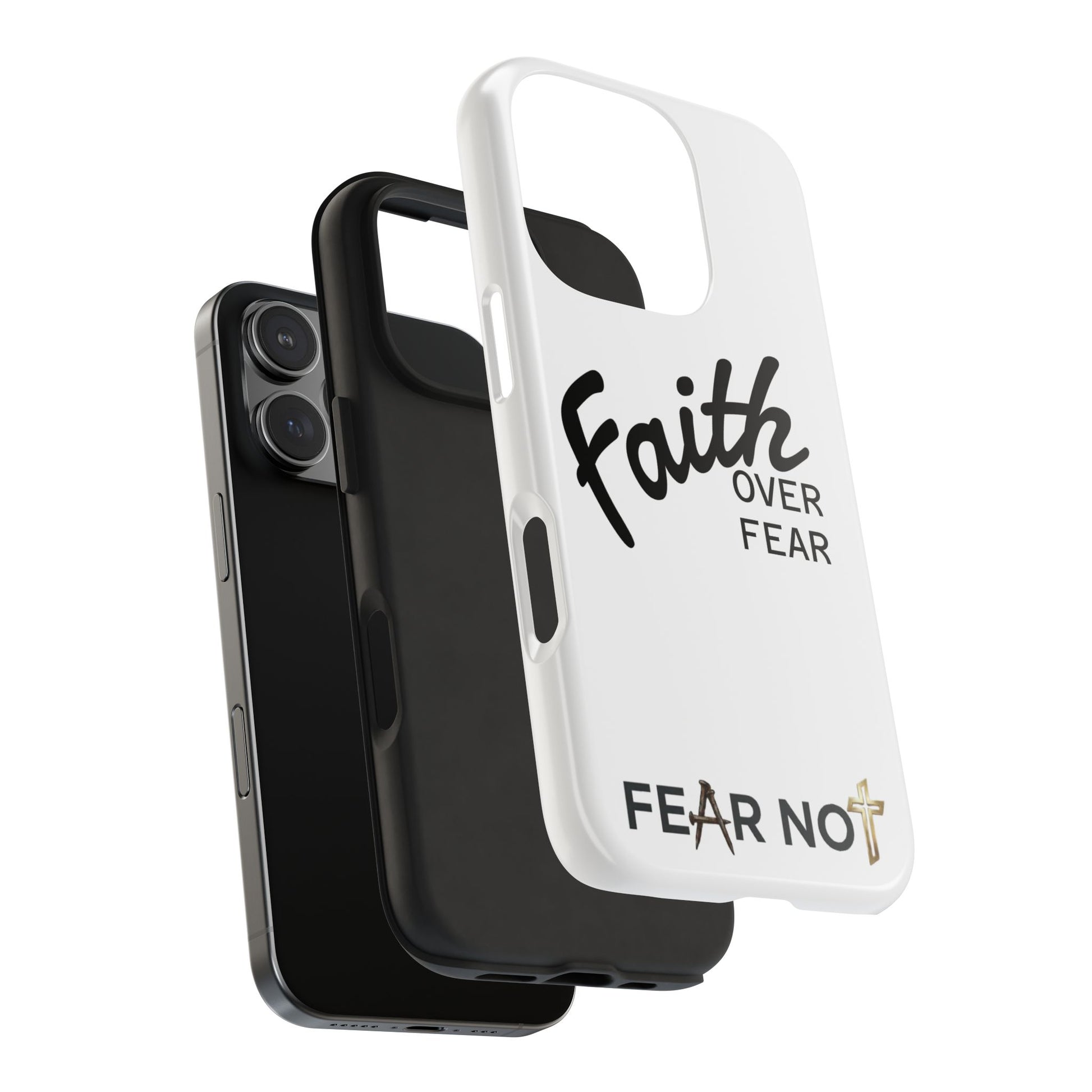 Carry a quiet declaration of courage with this slim, glossy phone case. Clean white with bold, handwritten "Faith over Fear" lettering and a subtle "Fear Not" footnote with a small cross — it feels like a steadying reminder in your pocket. The two-piece construction and soft inner liner cushion against drops while the raised bezel helps keep the screen safe when you set the phone face down. It slips easily into a bag, catches the light with a glossy finish, and keeps its look outdoors thanks to UV protection. For someone who wants daily encouragement woven into everyday gear, this case blends faith-forward style with dependable protection.