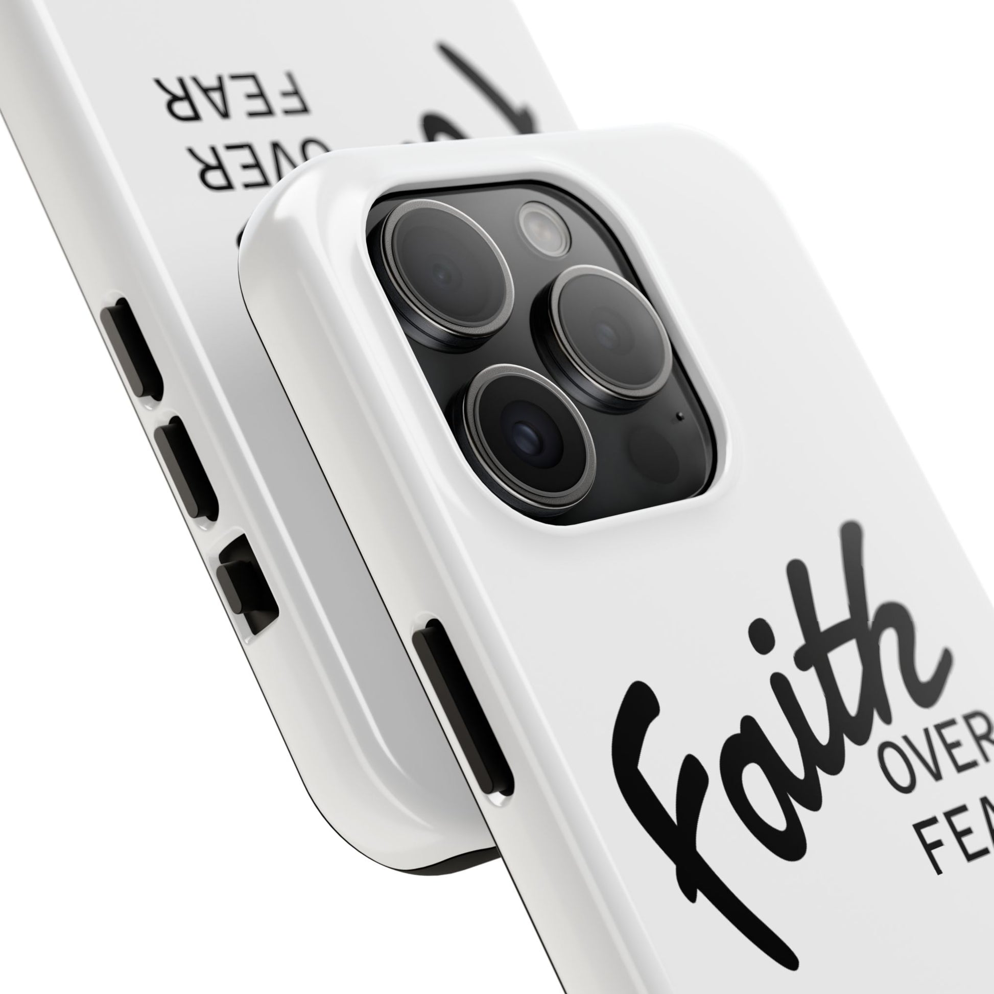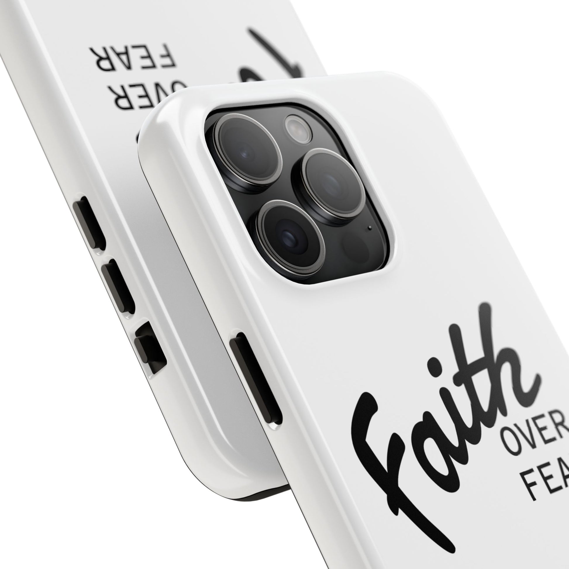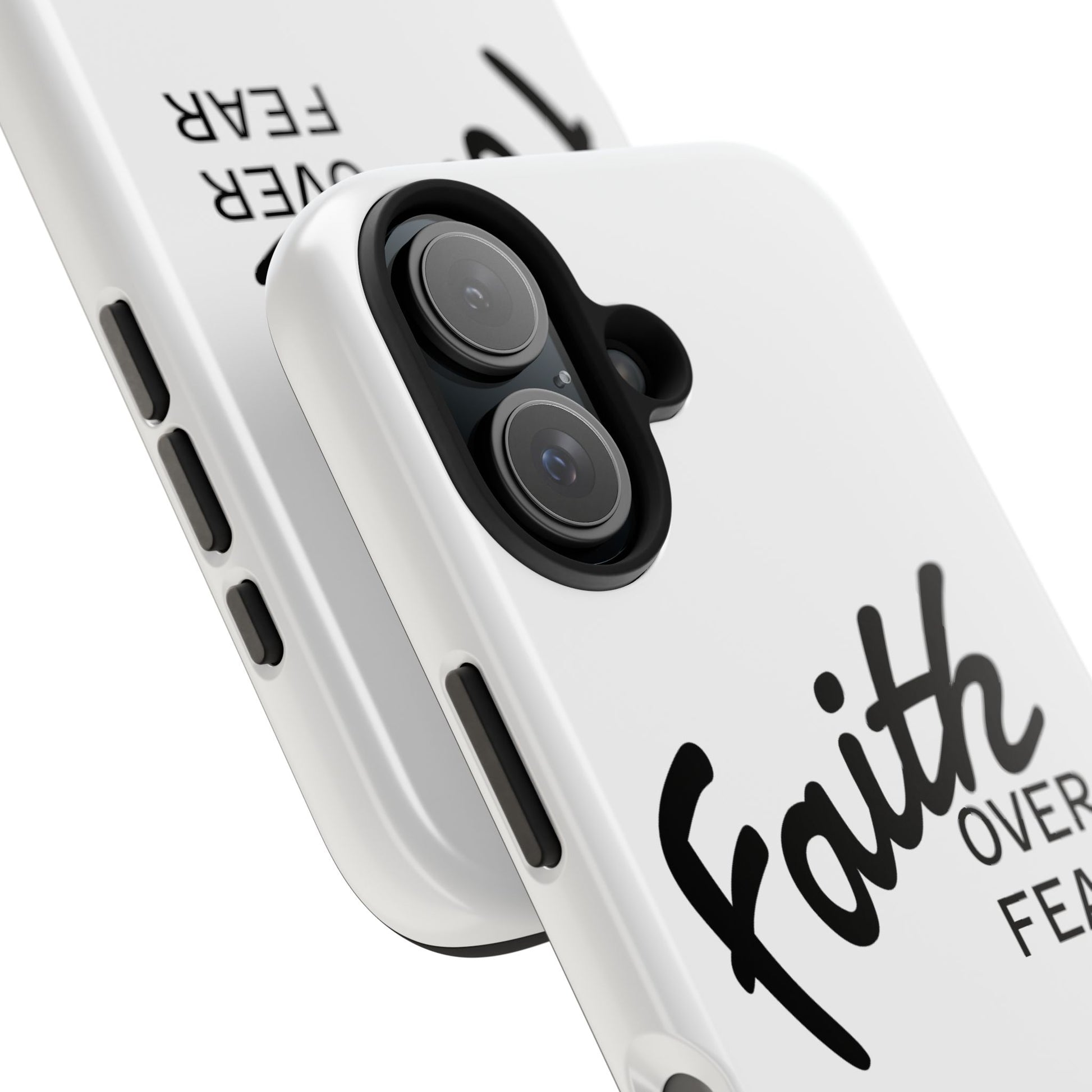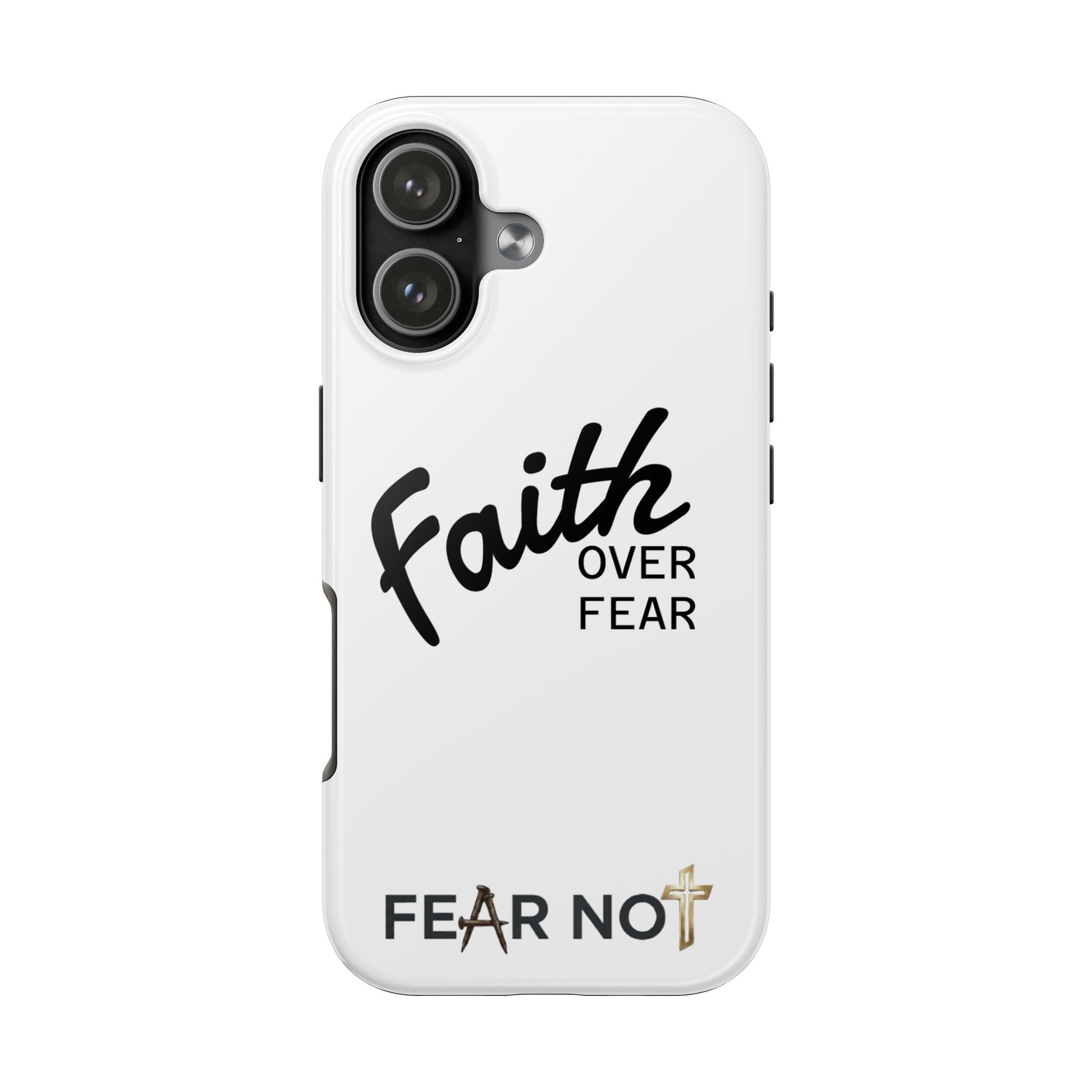 Carry a quiet declaration of courage with this slim, glossy phone case. Clean white with bold, handwritten "Faith over Fear" lettering and a subtle "Fear Not" footnote with a small cross — it feels like a steadying reminder in your pocket. The two-piece construction and soft inner liner cushion against drops while the raised bezel helps keep the screen safe when you set the phone face down. It slips easily into a bag, catches the light with a glossy finish, and keeps its look outdoors thanks to UV protection. For someone who wants daily encouragement woven into everyday gear, this case blends faith-forward style with dependable protection.