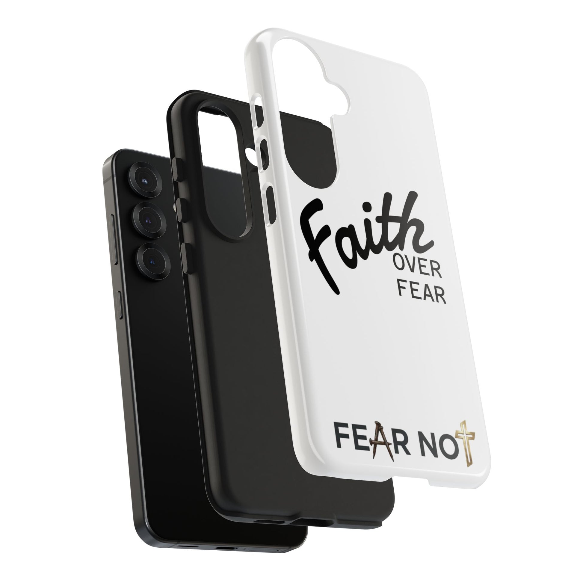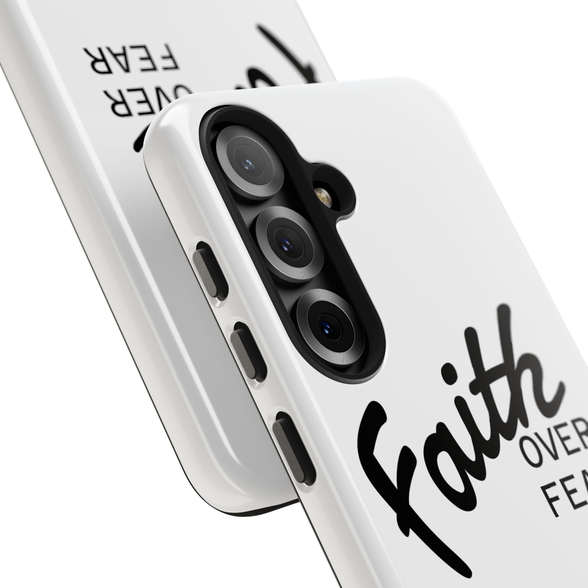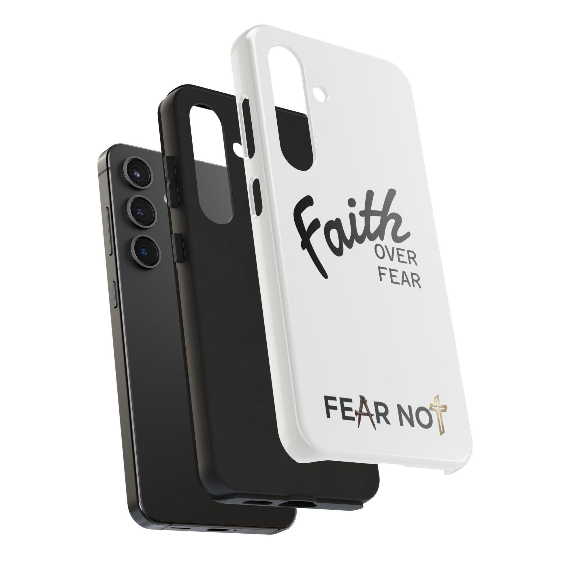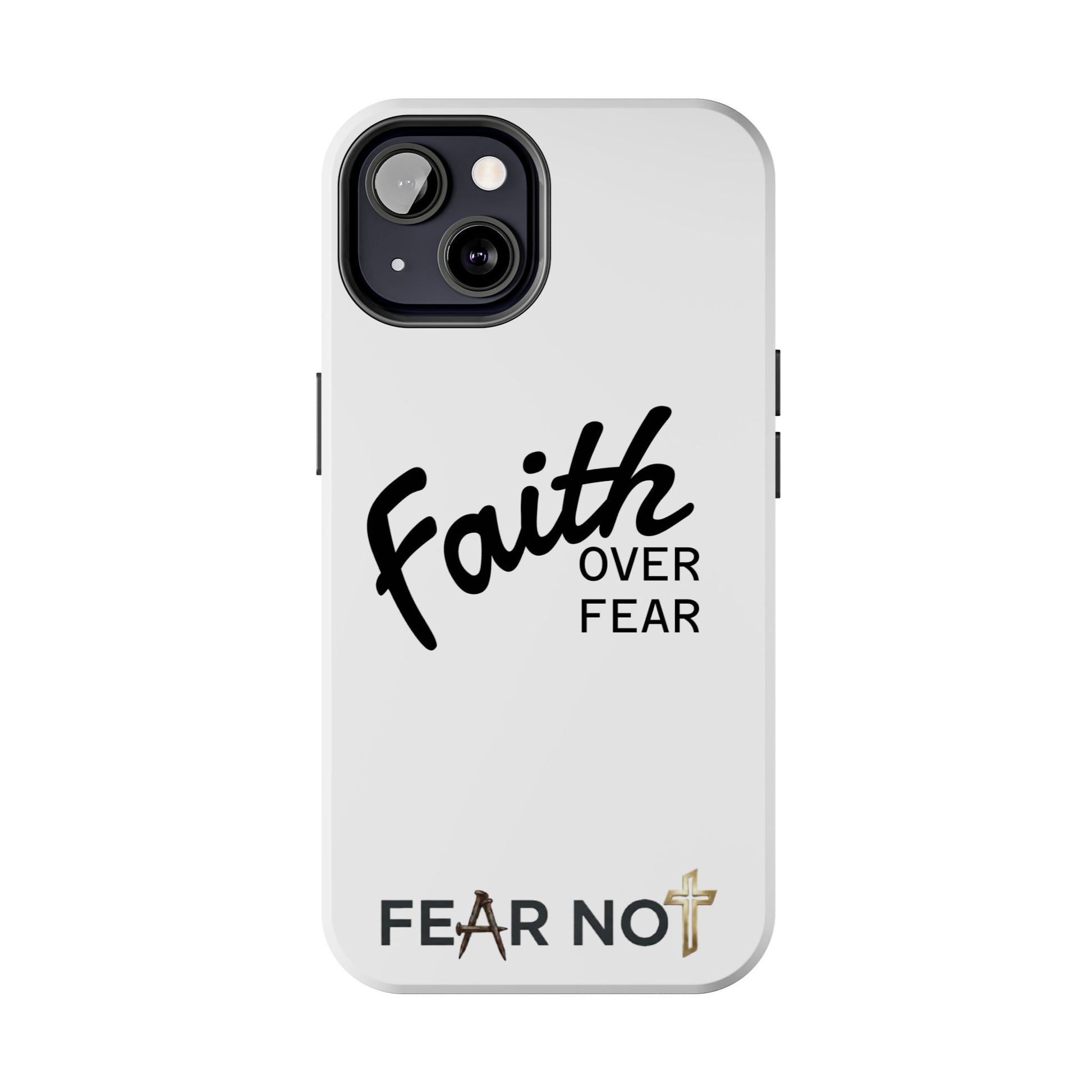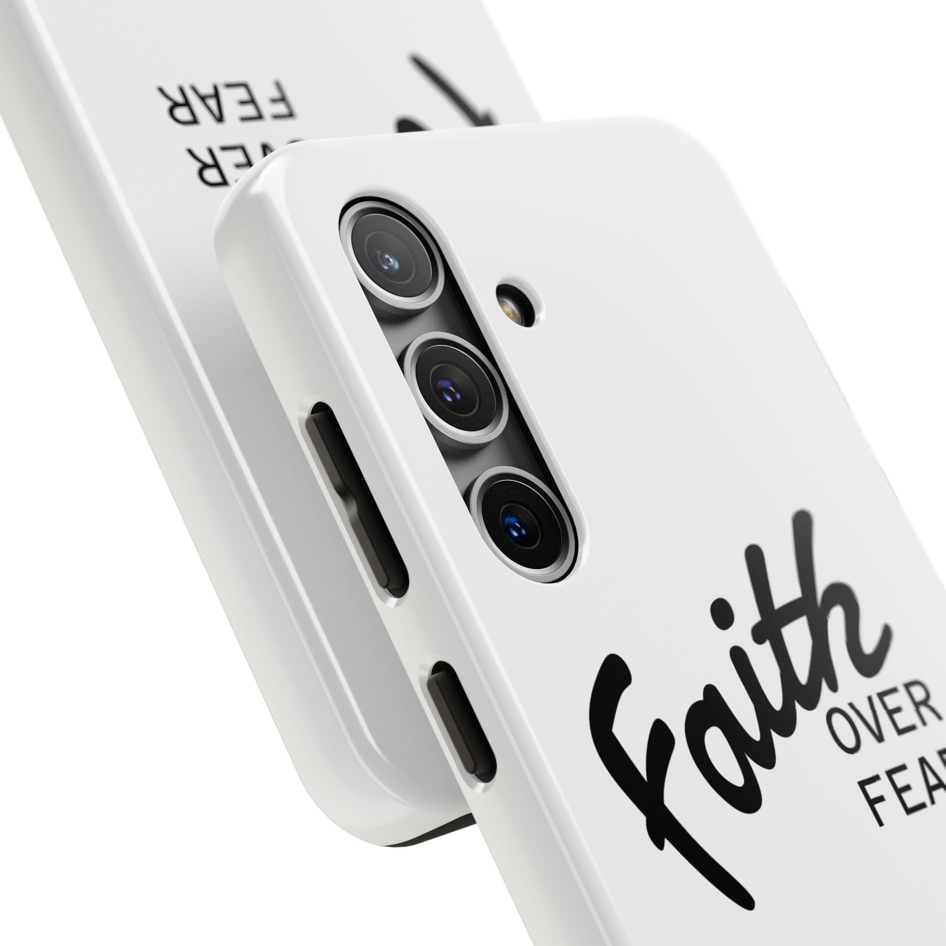 Carry a quiet declaration of courage with this slim, glossy phone case. Clean white with bold, handwritten "Faith over Fear" lettering and a subtle "Fear Not" footnote with a small cross — it feels like a steadying reminder in your pocket. The two-piece construction and soft inner liner cushion against drops while the raised bezel helps keep the screen safe when you set the phone face down. It slips easily into a bag, catches the light with a glossy finish, and keeps its look outdoors thanks to UV protection. For someone who wants daily encouragement woven into everyday gear, this case blends faith-forward style with dependable protection.